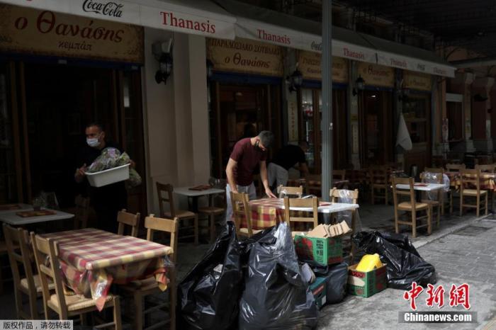 資料圖:希臘雅典,一家餐館的服務生在收拾餐桌。