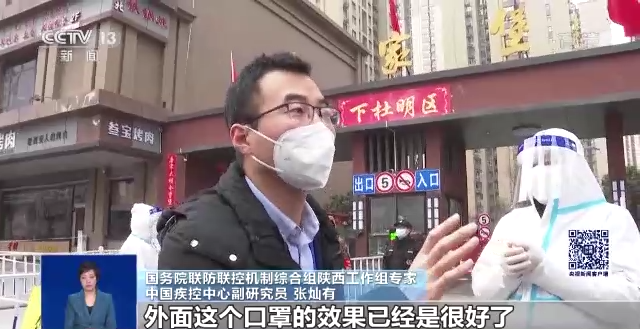 *國務院聯防聯控機制綜合組陝西工作組專家 中國疾控中心副研究員 張燦有:*裏面就不用再戴外科口罩了,N95口罩與面部的貼合本身是不允許再有其他任何東西的阻擋。你戴上兩個,防護效果反而就沒有那麼好了,容易漏氣。所以如果戴這個醫用防護口罩,裏面就不要再戴任何東西。外面這個口罩的效果已經很好了,不需要戴兩層。