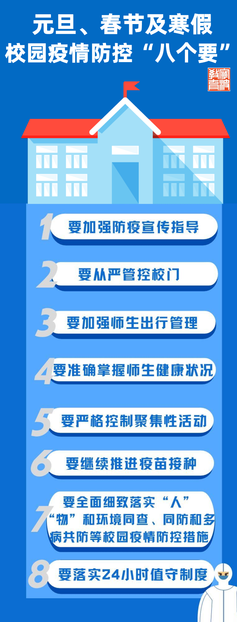 2022年元旦、春節及寒假即將到來,為做好“雙節”及寒假校園疫情防控工作,全力確保假期師生的身體健康和生命安全,寧波市教育局就學校做好假期防疫工作提出“八個要”: