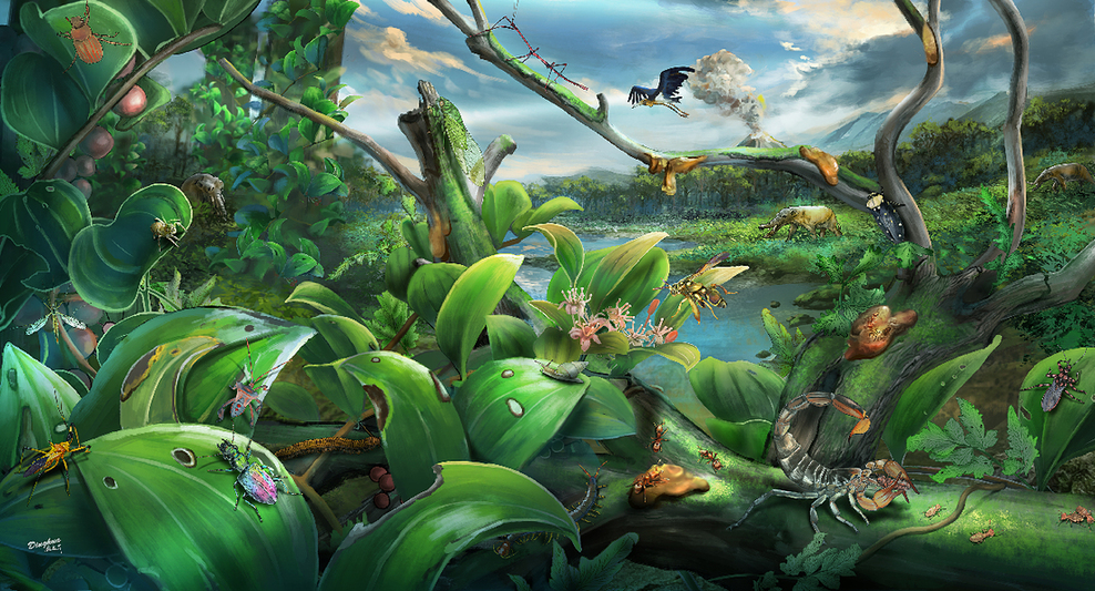 重慶秀山羅德洛世動物羣生態復原圖。鄭秋暘繪,中科院古脊椎動物與古人類研究所供圖