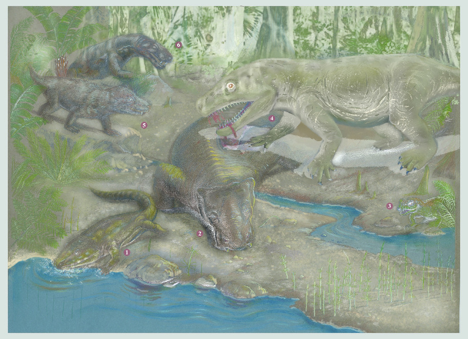 復原圖:二疊紀的麗齒獸咬殺吞食大型植食獸足類,兩者都在二疊紀末大滅絕中滅亡。繪製:郭肖聰