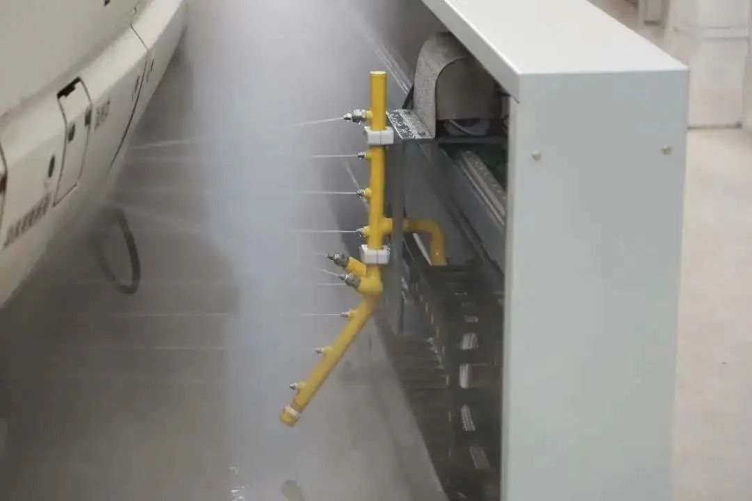 為了清除高鐵列車運行期間車身出現的結冰積雪,中國鐵路哈爾濱局集團有限公司自主研發了國內首個“HTK-CBX0型高寒高鐵融冰除雪裝置”,通過低壓温水噴掃方式,對動車組各重點部位全方位噴掃 。操作員還可以根據動車組積冰情況,調整噴水壓力、温度、速度。
