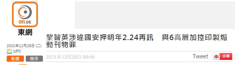 港媒:黎智英等7人被加控一項印製煽動刊物罪,案件押至明年2月再審