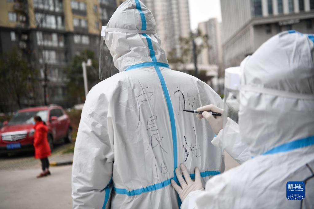 12月27日,在西安市雁塔區孟村小區,社區工作人員在盧晨陽的防護服寫加油標語。新華社記者 張博文 攝