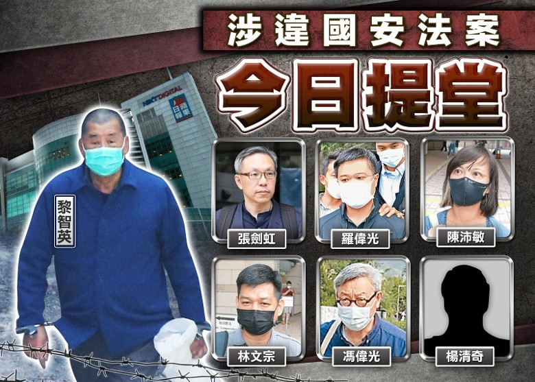 報道稱,另外6名被告,包括壹傳媒前行政總裁張劍虹、前《蘋果日報》副社長陳沛敏、總編輯羅偉光、執行總編輯林文宗、主筆馮偉光(筆名盧峯)和主筆楊清奇(筆名李平),各被指控1項串謀勾結外國或者境外勢力危害國家安全罪,該罪指控他們於2020年7月1日至2021年4月3日期間(包括首尾2天),在香港與蘋果日報有限公司、蘋果日報印刷有限公司、蘋果日報互聯網有限公司、黎智英及其他人一同串謀,請求外國或者境外機構、組織、人員實施對香港特別行政區或者中華人民共和國進行制裁、封鎖或者採取其他敵對行動。