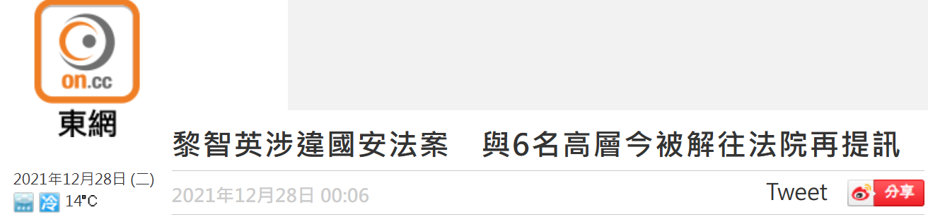 港媒:被指控涉嫌違反香港國安法,法院今提審黎智英與其公司6名高層