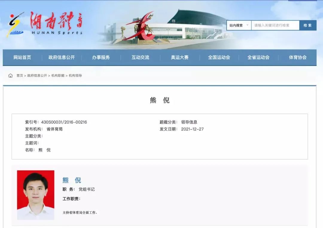 此外,湖南省體育局官網“機構領導”欄目顯示,熊倪目前主持省體育局全面工作。