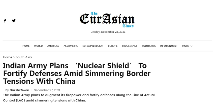 《歐亞時報》在報道中稱,印度陸軍正計劃在印中邊境實際控制線沿線增強火力、加強防禦,報道還用上了“核盾牌”這樣的字眼來形容這一防禦設施。
