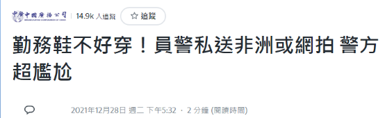【環球網報道 記者 尹豔輝】據台灣中時新聞網28日報道,台中市警察局勤務裝備每年編5000萬元(新台幣,下同)預算為警員採購勤務裝備,但有警員疑因勤務鞋不好穿,有的上網拍賣,還有人捐到非洲做愛心。民進黨議員質疑預算白花了?連年未發揮應有成效,針對此事,有台媒形容“警方超尷尬”。