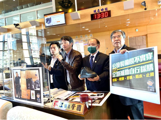 江肇國稱,基層警員勤務服裝及配件連年編列5000多萬,明年度以每人7883元,計6559人共編列5379萬,卻見警員收集勤務鞋捐至非洲做愛心,或上網兜售,或閒置在家等着丟棄,勤務鞋並不符合透氣合腳、輕便舒適、防水止滑等需求,警察局應就警員服裝的配發改革,讓預算彈性執行達到成效。