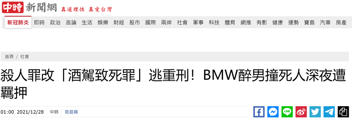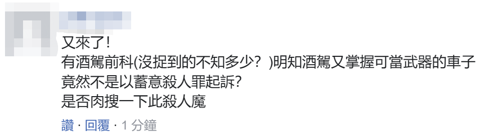對於酒駕撞飛一家四口導致1死3傷並有前科的黃姓男子可能逃避重刑,有島內網友質疑,“又來了!有酒駕前科(沒捉到的不知多少?)明知酒駕又掌握可當武器的車子,竟然不是以蓄意殺人罪起訴?”↓