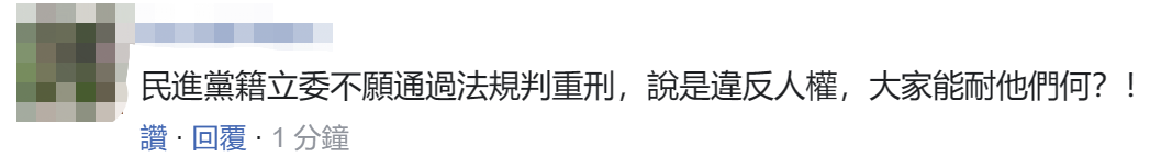 還有網友無奈表示,“民進黨籍‘立委’不願通過法規判重刑,大家能耐他們何?!”↓