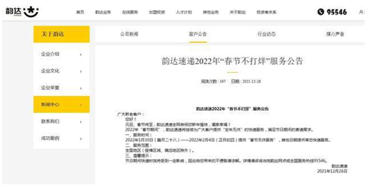 同日,韻達快遞也宣佈將在春節假期期間繼續為廣大客户提供“全年無休”的快遞服務,並且“春節無休服務”的服務時間和服務範圍均與中通快遞一致。但有趣的是,韻達並未在公告中明確春節期間快件寄遞的服務費用是否會有調整。