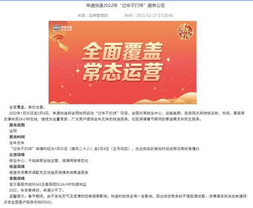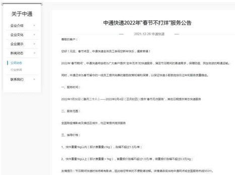 12月26日,中通快遞發佈公告,宣佈將在2022年春節期間為廣大客户提供“全年無休”的快遞服務,滿足消費者節日期間的寄遞需求。中通方面表示,將在2022年1月30日(臘月二十八)至2022年2月4日(正月初四)提供“春節無休服務”,服務範圍除受疫情影響及偏遠區域外,均正常提供攬派服務。同時,在“春節無休服務”期間每單的服務計費將有所調整,重量在1千克以內的快件漲幅不超過1.5元/單,而重量超過1千克的快件首重報價漲幅不超過1.5元/單,續重報價漲幅不超過0.3元。中通還強調,儘管推行了“春節無休服務”服務,但節假日期間快遞時效仍將受到一定的影響。