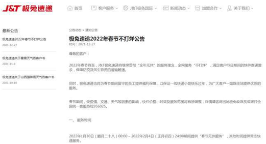 12月27日,極兔速遞成為第四個宣佈將在2022年春節期間持續提供快件寄遞服務的企業。極兔方面在公告中表示,極兔速遞將投入人力、運力和場地,滿足客户節日期間的快件寄遞需求,保障防疫及民生物資的運輸暢通。同時,極兔速遞也將為春節期間留守的員工提供相應的福利保障,以保證一線快遞小哥快樂過年。此外極兔方面也在公告中指出,受疫情、交通、天氣等因素的影響,快件價格、時效及服務範圍將會有所調整。