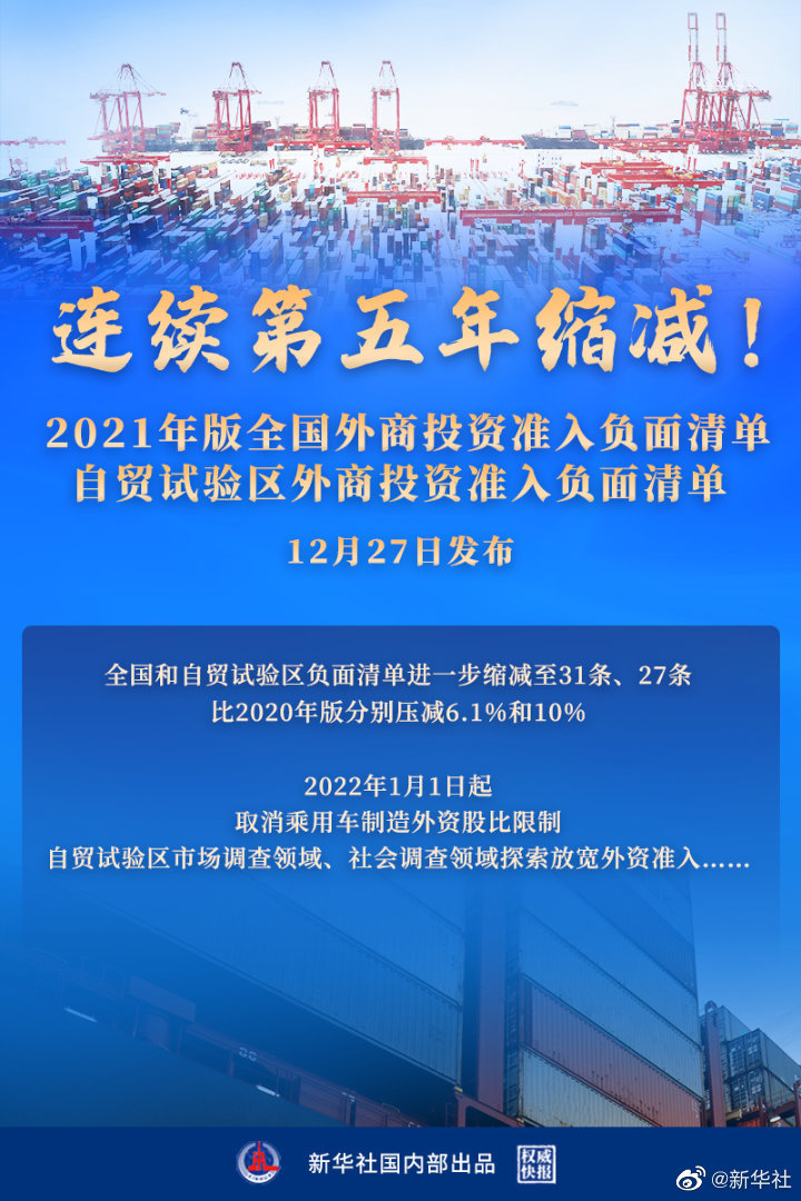 新華社北京12月27日電(記者謝希瑤、安蓓)國家發展改革委、商務部27日對外發布《外商投資准入特別管理措施(負面清單)(2021年版)》和《自由貿易試驗區外商投資准入特別管理措施(負面清單)(2021年版)》,自2022年1月1日起施行。這是我國連續第五年縮減全國和自貿試驗區負面清單。