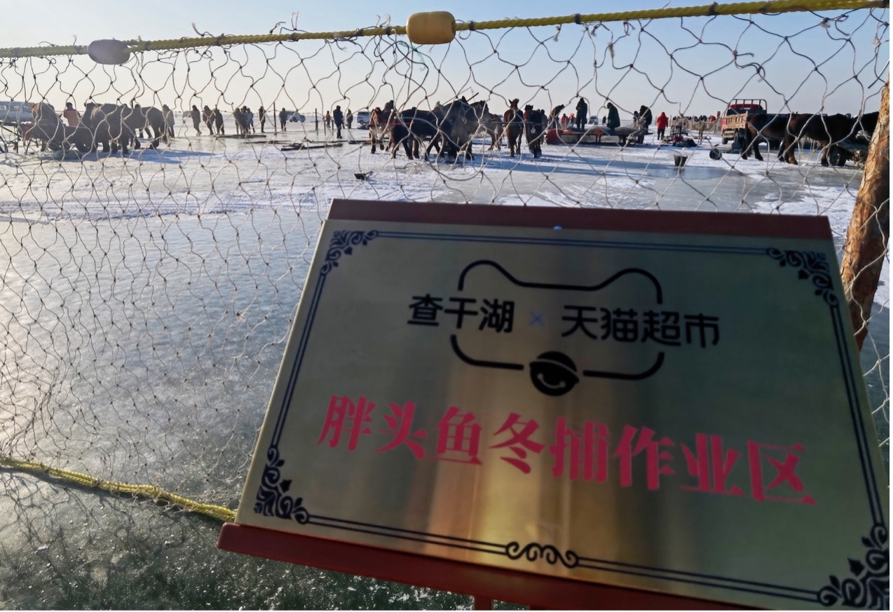 12月28日,在“天貓超市×查干湖”胖頭魚冬捕作業區,一網網因《舌尖上的中國》而走紅的胖頭魚,從半米厚的冰層下被打撈出水,自然速凍後,立即被送往湖邊的貓超專屬漁場進行檢測、分揀、打包,實現從冬捕冰面到消費者餐桌的“產地直髮”。