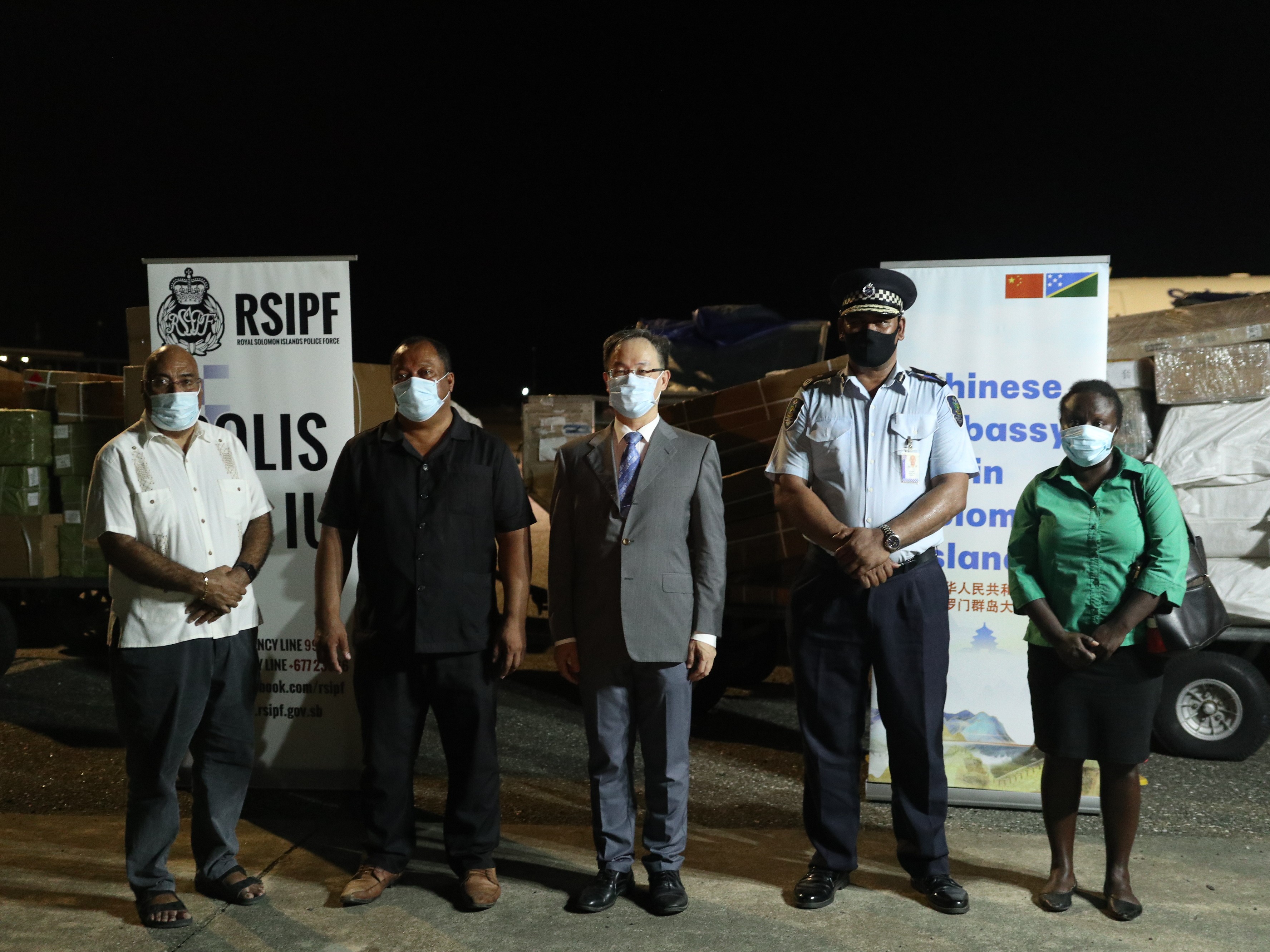 12月29日晚,中國政府援助所羅門羣島政府首批警用物資運抵所首都霍尼亞拉。中國駐所羅門羣島大使李明、所代理警察部長帕納基塔斯、警察部常秘加洛凱勒、外交部常秘貝克、警察總監曼高等赴機場迎接。