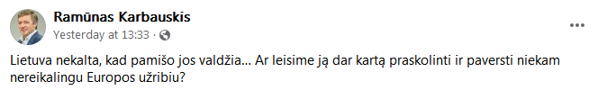 “加布裏埃柳斯·蘭茨貝爾吉斯(立陶宛外交部長)和日吉曼塔斯·帕維利奧尼斯(議會外事委員會主席)成功地使立陶宛的對華政策變得如此複雜,以至於他們自己也承認‘中國對立陶宛的制裁’是前所未有的。用人類語言來解釋,就是立陶宛企業將先遭受損失,隨後將不得不通過提高立陶宛人民的税收來彌補這些損失,金額將達到數十億(立特),從長遠來看,這將成為阻礙立陶宛經濟發展的原因。”卡爾鮑斯基斯在臉書文章中寫道。