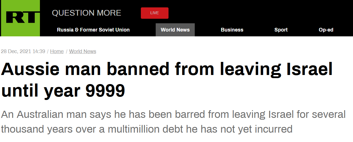 俄媒:澳男子被禁止在公元9999年前離開以色列,除非支付子女撫養費