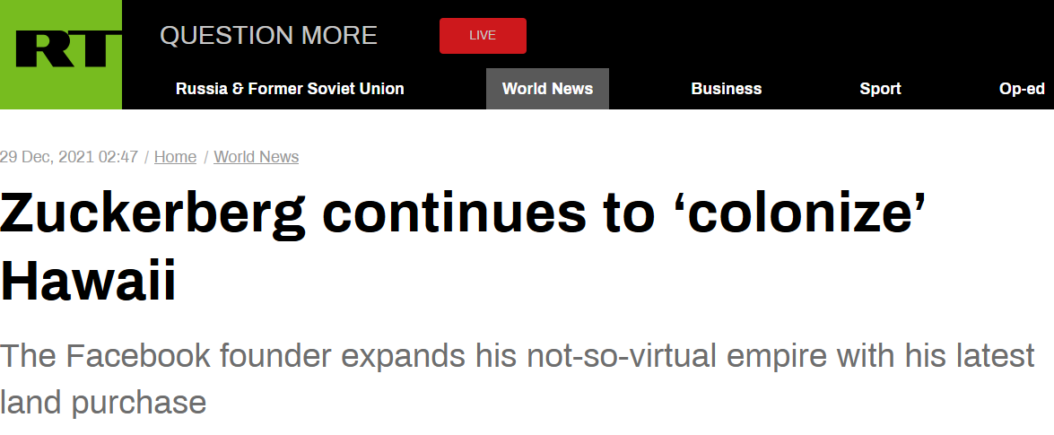 這也並非扎克伯格第一次在考愛島購置土地。RT稱,2014年,扎克伯格夫婦以近1億美元在島上購置了707英畝的房產,並在房產周圍建起圍牆以阻止當地人進入皮拉海灘引發不滿,扎克伯格由此被當地人指控試圖“殖民”考愛島。三年後,扎克伯格為自己的行為登報道歉。今年4月,他花費5300萬美元收購近600英畝的土地,包括島上的卡胡艾納種植園和拉森海灘的大部分土地。