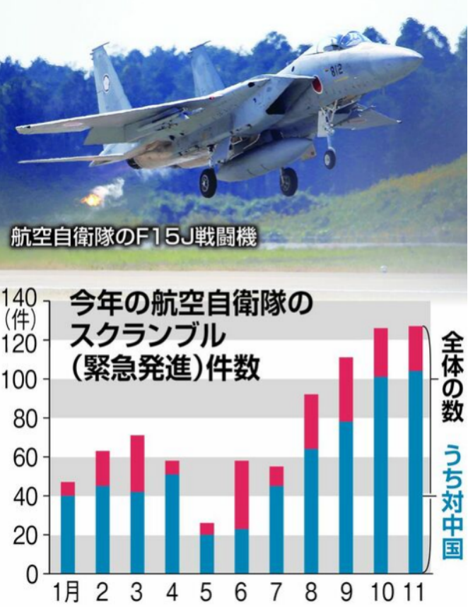 報道稱,今年5月航空自衞隊飛機緊急起飛的情況共計26次,其中20次係為應對中國軍機。這個數字隨後逐月增加,11月緊急起飛次數共計127次,其中104次係為應對中國軍機。