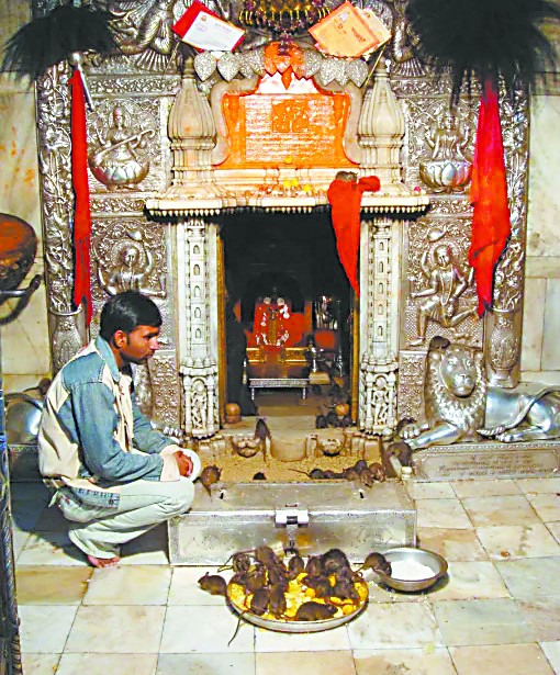 走廊裏擺滿了充足的穀物和牛奶,不少老鼠在窸窸窣窣地享用午餐。大大小小、肥肥瘦瘦的老鼠在內堂的天井,光明正大地享受着冬日的陽光。在這裏它們不用鬼鬼祟祟,不再害怕陽光,可以明目張膽地當過街老鼠,這裏的人當然不能喊打,疼它們都來不及呢!信徒相信這些老鼠下一輩子會投胎成聖人,而聖人的前世當然得尊敬。信徒把供品獻給老鼠,老鼠吃不完的,就留給自己,因為他們相信吃下這些老鼠的口水,會帶來更多的好運!