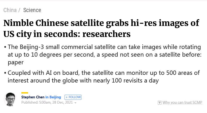 “中國小型商業衞星‘北京三號’可能是有史以來最強大的地球觀測衞星之一,它在500公里的軌道上,僅用42秒就拍下了舊金山市中心(3800平方公里)的圖像。”