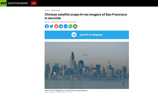 與此同時,多家外媒也都關注到這一消息。美國“科技博客”(techeblog)網站稱,“中國的‘北京三號’衞星在42秒內拍攝到令人難以置信的舊金山高分辨率圖像”;“今日俄羅斯”(RT)表示,“中國衞星在數秒鐘內就拍下舊金山市的高分辨率圖像”;伊朗塔斯尼姆通訊社也説,“研究人員:敏捷的中國衞星在幾秒鐘內捕捉到美國城市的高分辨率圖像”;印度Wionews網站説,“有報道稱,中國衞星在幾秒鐘內就能拍攝到美國城市圖像。”