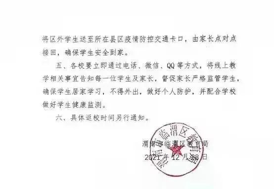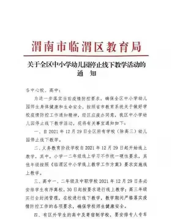 二、義務教育階段學校自2021年12月29日起開始線上教學,其中,小學一二年級線上學習不作統一硬性要求,其他年級按照《臨渭區中小學線上教學工作方案》要求實施線上教學。