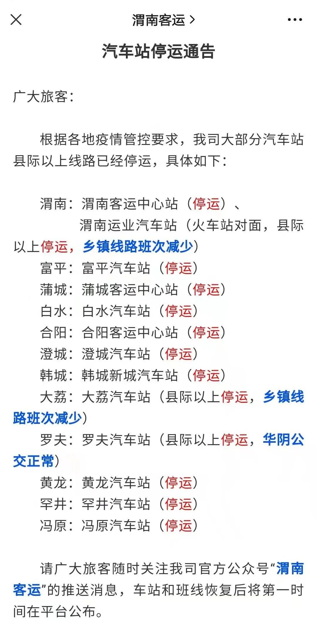 另外,渭運集團同一天也發佈汽車站停運通告稱:根據各地疫情管控要求,公司大部分汽車站縣際以上線路已經停運。具體為:富平、蒲城、白水、合陽、澄城、韓城等汽車站停運;渭南運業汽車站、大荔汽車站是縣際以上停運,鄉鎮線路班次減少;羅夫汽車站是縣際以上停運,華陰公交正常。請廣大旅客隨時關注其官方公眾號“渭南客運”的推送消息,車站和班線恢復後將第一時間在平台公佈。