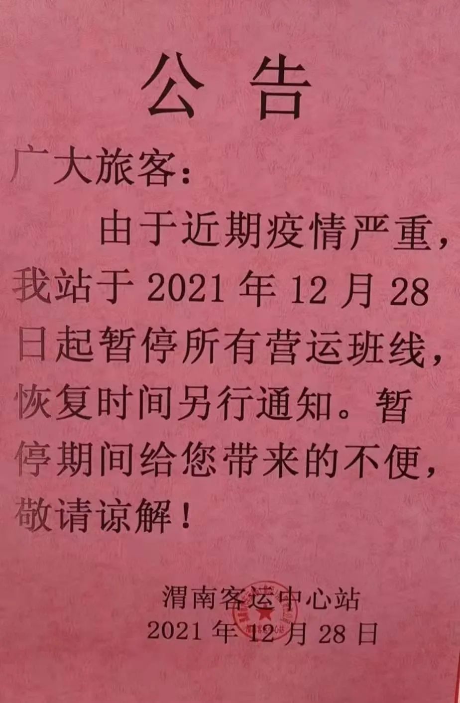渭南客運中心站最新發布公告稱:由於近期疫情嚴重,站上自12月28日起暫停所有營運班線,恢復時間另行通知。