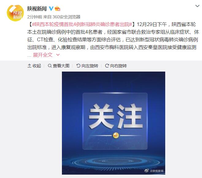 【#陝西本輪疫情首批4例新冠肺炎確診患者出院#】12月29日下午,陝西省本輪本土在院確診病例中的首批4名患者,經國家省市聯合救治專家組從臨牀症狀、體徵、CT檢查、化驗檢查結果等方面綜合評估,已達到新型冠狀病毒肺炎確診病例出院標準,進入康復觀察期,由西安市胸科醫院轉入西安秦皇醫院接受健康監測、康復隔離。