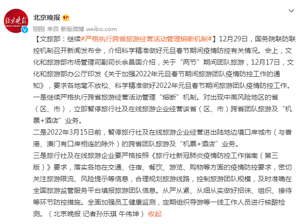 【文旅部:繼續#嚴格執行跨省旅遊經營活動管理熔斷機制#】12月29日,國務院聯防聯控機制召開新聞發佈會,介紹科學精準做好元旦春節期間疫情防控有關情況。會上,文化和旅遊部市場管理司副司長餘昌國介紹,關於“兩節”期間團隊旅遊,12月17日,文化和旅遊部辦公廳印發《關於加強2022年元旦春節期間旅遊團隊疫情防控工作的通知》,要求各地毫不放鬆、科學精準做好2022年元旦春節期間旅遊團隊疫情防控工作。