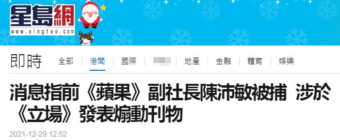 【環球網報道 記者 康博浩】綜合“星島網”“東網”等港媒消息,香港警方國安處今早(29日)以涉嫌串謀發佈煽動刊物罪,分別拘捕 “立場新聞”6名高層或前高層。有消息稱,早前被控違反香港國安法,正在大欖女懲教所還柙的前《蘋果日報》副社長陳沛敏也被拘捕,其涉嫌在“立場新聞”發表煽動刊物。
