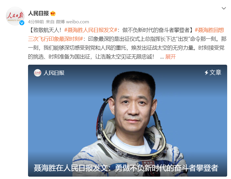 聶海勝在人民日報發文:勇做不負新時代的奮鬥者攀登者