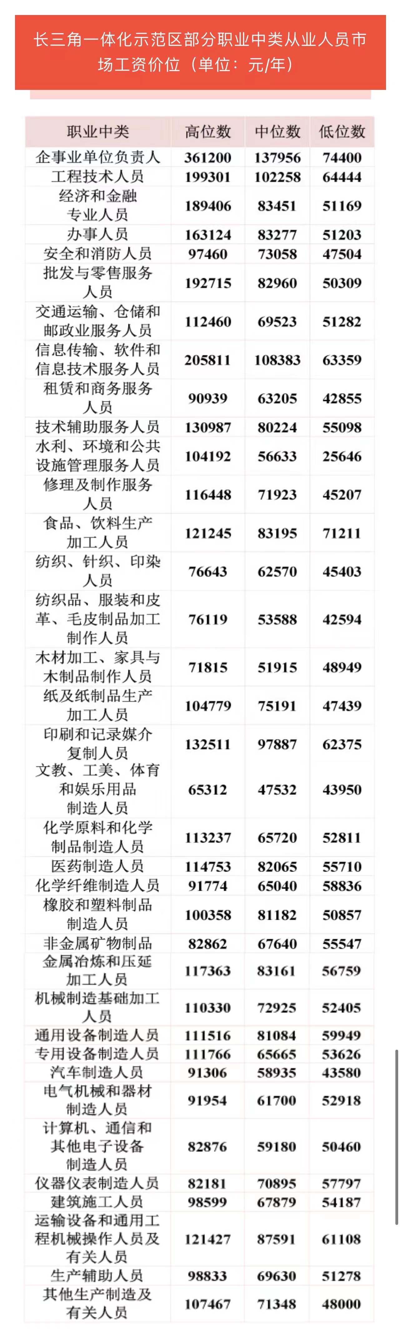 據介紹,上海、江蘇、浙江省人力資源和社會保障部門深入挖掘應用2021年企業薪酬調查數據資源,對一體化示範區(上海青浦、江蘇吳江、浙江嘉善)內305户製造業企業、11.12萬名從業人員2020年工資性收入數據進行分析、共同研究形成,併為一體化示範區企業及求職者提供了市場價位信息參考。