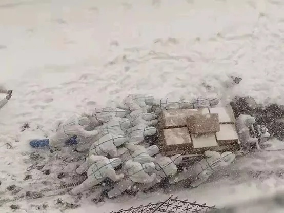2021剛開年,這張照片便在網上刷屏,大連海洋大學師生志願者頂風冒雪艱難前行,給封閉在宿舍樓的學生們運送防疫物資。