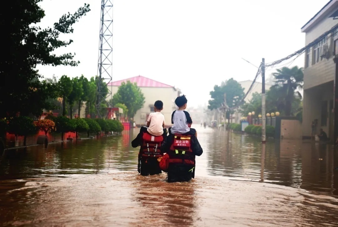 兩名消防隊員,馱着兩個孩子,小心翼翼地蹚過齊腰深的積水,像極了父親的背影。