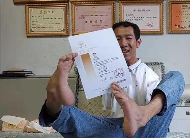 7月,“無臂男孩”彭超在四川老家收到了心心念唸的同濟大學研究生錄取通知書。心底有夢,眼中有光,彭超用腳書寫了熱血人生。