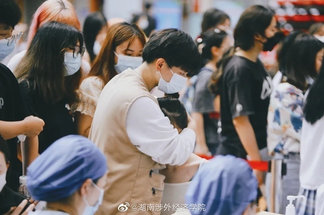 新冠疫苗接種現場,一對情侶輕輕地擁抱,男生小聲地安慰着女生。陪伴,就是愛的流露。