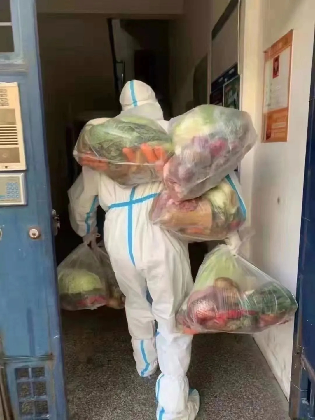 江西上饒的一位社區志願者,渾身上下掛滿蔬菜,給小區居民分發物資。略顯佝僂的身軀,在我們眼中是那麼偉岸。