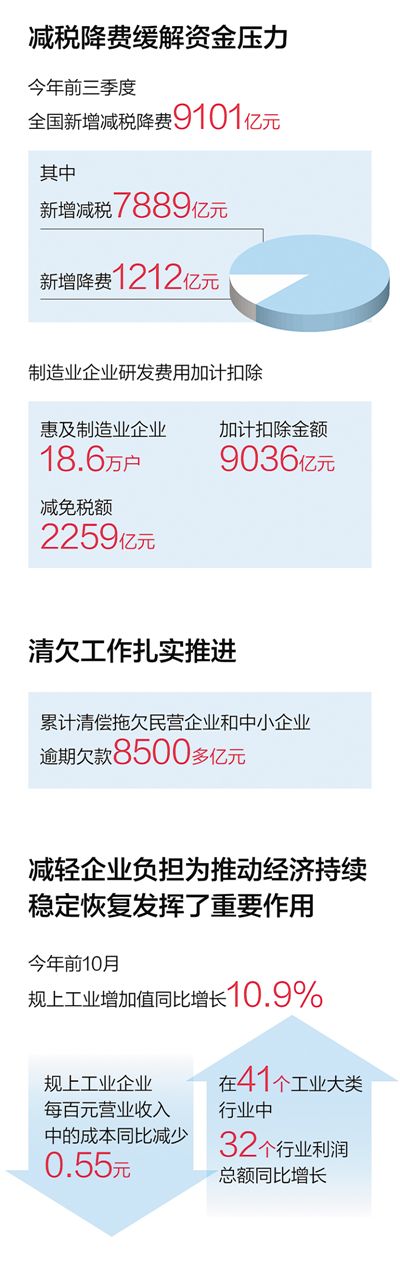 今年前三季度,全國新增減税降費9101億元;截至10月底,全國市場監管部門共檢查收費單位6.5萬家,退還企業24.6億元……最近,企業“減負”成績單公佈,一項項政策舉措聚焦助企紓困,有力增強了市場主體發展信心。