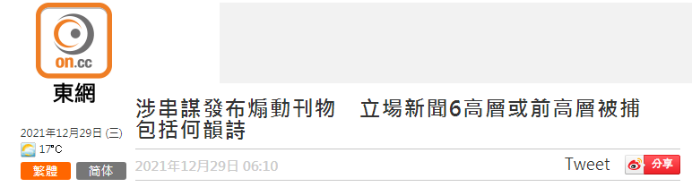 “東網”稱,據瞭解,被拘捕6人為何韻詩、鍾化權、周達智、吳靄儀、方敏生、林紹桐,當中5人為前董事,其餘1人為署理總編輯,涉嫌提供平台發佈煽動性文章,違反《刑事罪行條例》第9及10條串謀煽動意圖罪。