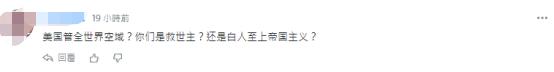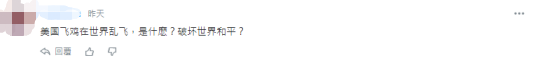 對於孫曉雅代表美方這種不談自己、大談他國的做法,有島內網友並不認同,稱:“美國飛雞(注:為‘飛機’)在世界亂飛,是什麼?破壞世界和平?”“美國管全世界空域?你們是救世主?還是白人至上帝國主義?”↓