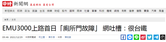 然而,“中時新聞網”注意到,有島內網友在臉書上發文表示,首日投入運營的台鐵EMU3000型城際列車408車次,結果該列車7車廂的廁所故障了,該網友忍不住吐槽稱“第一天,很台鐵耶!”。