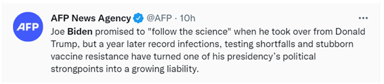 拜登在接替前任特朗普時,曾承諾在抗疫方面“遵循科學”。但在執政近一年後,創紀錄的感染病例、新冠病毒檢測能力不足以及民眾頑固地反對疫苗,已將其總統任期內的政治優勢之一變成了日益沉重的負擔。