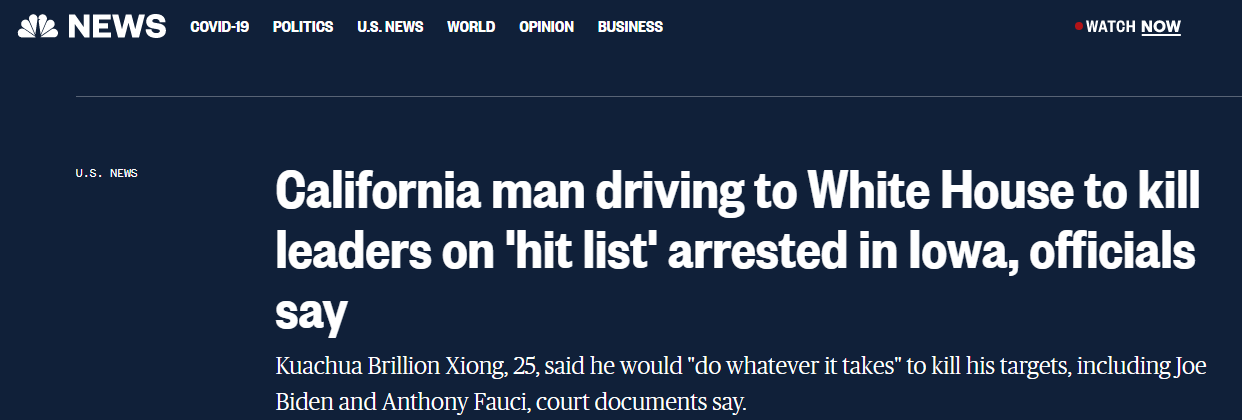 據報道,該男子25歲,名叫Kuachua Brillion Xiong,居住在加利福尼亞州。調查人員在法律文件中寫道,該男子駕駛的汽車12月21日在艾奧瓦州被警方攔截,警方在車上發現一支AR-15步槍、彈藥、上膛的彈夾、防彈衣和醫療包。根據週三公佈的法庭文件,該男子在手機上使用了一個地圖應用程序,並將其目的地設定為白宮。調查人員稱,男子12月18日從加利福尼亞州出發,然後開車前往白宮。