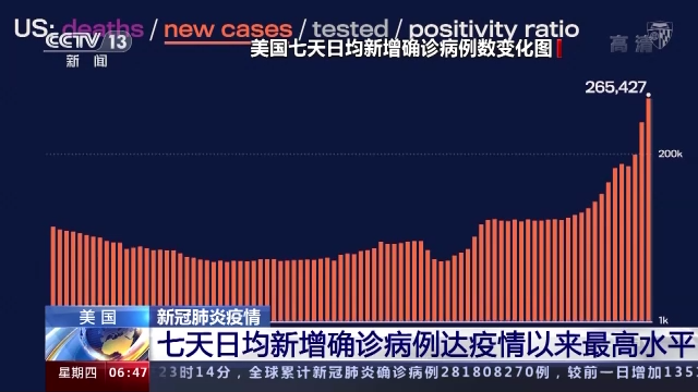 根據美國約翰斯·霍普金斯大學的統計數據,截至當地時間29日,美國七天日均新增確診病例數已超過26.5萬,達到了美國疫情暴發以來的最高水平。
