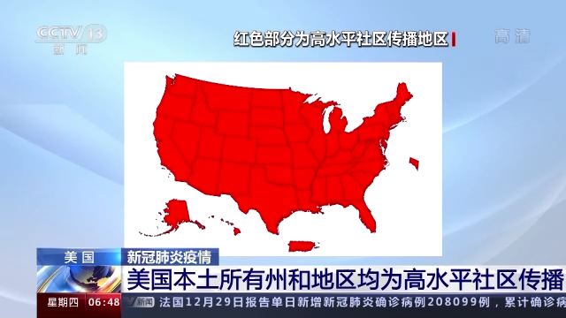 美國疾控中心的統計數據顯示,在截至本月28日的7天時間裏,美國本土所有州和地區都處於高水平社區傳播的狀態。高水平社區傳播指的是,過去7天每10萬人中至少有100例新增確診病例。數據顯示,在截至28日的7天時間裏,美國每10萬人中,平均有約507例新增確診病例。